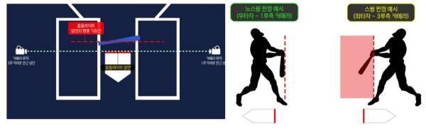 판정 기준은 현재 퓨처스리그에서 적용하고 있는 기준과 동일하게 한다. 타자가 투수의 투구를 타격하려는 의도로 배트를 휘두르는 동작(스윙)을 할 때, 그 여세로 인해 배트(배트 끝을 기준으로 판단)의 각도가 홈플레이트 앞면과 평행을 이루는 기준선보다 투수 방향으로 넘어갔을 때 심판은 스윙 스트라이크로 판정한다. 배트 끝의 각도가 타자석 기준 90도를 초과했을 때 스윙으로 판정하며, 이하인 경우는 스윙이 아닌 것으로 판정한다. 배트가 홈플레이트 앞면을 넘었는지 여부, 또는 손잡이 위치나 신체 회전 등은 판정 시 고려되지 않으며, 배트 끝의 각도가 기준선을 넘었는지 여부로 판정이 내려진다. 번트 시도는 체크 스윙 비디오 판독 대상이 아니다.