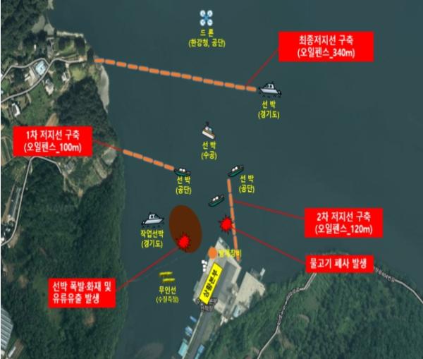 훈련에 참가한 기관들은 실제 사고 발생 상황을 가정하여 △사고 상황 전파 및 인명구조, △위기경보 발령(주의)과 대응조직 가동, △무인기(드론) 등을 활용한 오염 확산 범위 확인, △물리·기계적 방제작업(오일펜스, 유회수기, 흡착포 등) △폐사어 수거 및 수질 측정 등 단계별 임무를 수행한다.