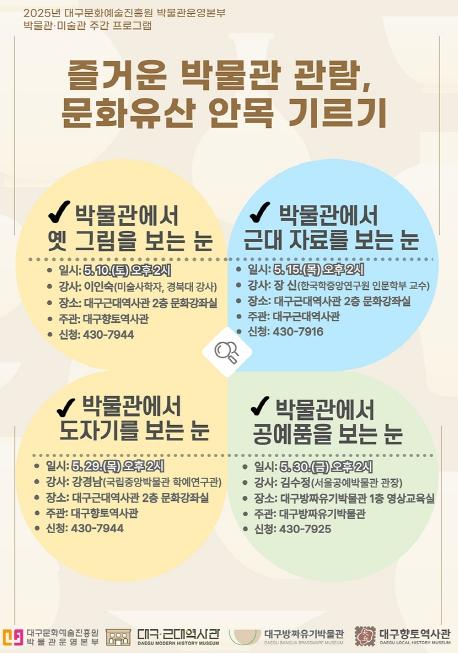 (재)대구문화예술진흥원 박물관운영본부 소속 대구 시립 3개 박물관인 대구근대역사관·대구방짜유기박물관·대구향토역사관에서는 ‘2025 박물관·미술관 주간’을 맞아 5월 2일부터 6월 1일까지 다채로운 문화행사를 개최한다.
