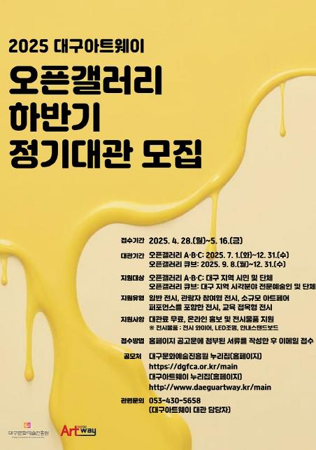 대구문화예술진흥원 대구아트웨이는 4월 28일부터 5월 16일까지 2025년도 하반기 오픈갤러리 정기대관 모집을 진행한다.