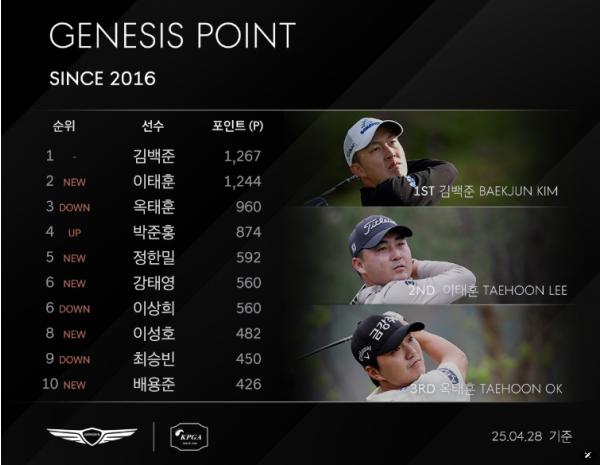 개막전 ‘제20회 DB손해보험 프로미 오픈’에서 생애 첫 우승을 달성하며 제네시스 포인트 1위에 올랐던 김백준은 ‘우리금융 챔피언십’에서 공동 10위에 오르며 제네시스 포인트 266.50포인트를 얻어 총 1,266.50포인트로 2개 대회 연속 제네시스 포인트 1위를 유지했다.