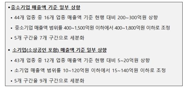 중소기업 매출액 기준 상향, 중소기업 44개 업종 중 16개, 소기업 43개 업종 중 12개 해당