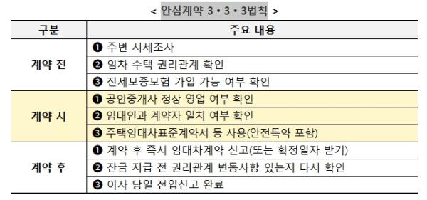 안심계약 3‧3‧3법칙에 따르면, 우선 계약 전 주변 시세를 충분히 조사하고, 등기사항전부증명서(등기부등본) 등을 통해 임차할 주택의 권리관계를 꼼꼼히 확인하며, 전세보증보험 가입이 가능한 집인지 보증사를 통해 문의하는 것이 중요하다는 것을 알 수 있다.