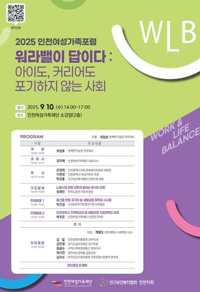 인천여성가족재단은 오는 9월 10일, 인구보건복지협회 인천지회와 공동으로 '2025 인천여성가족포럼'을 개최한다고 밝혔다.
