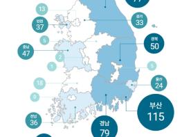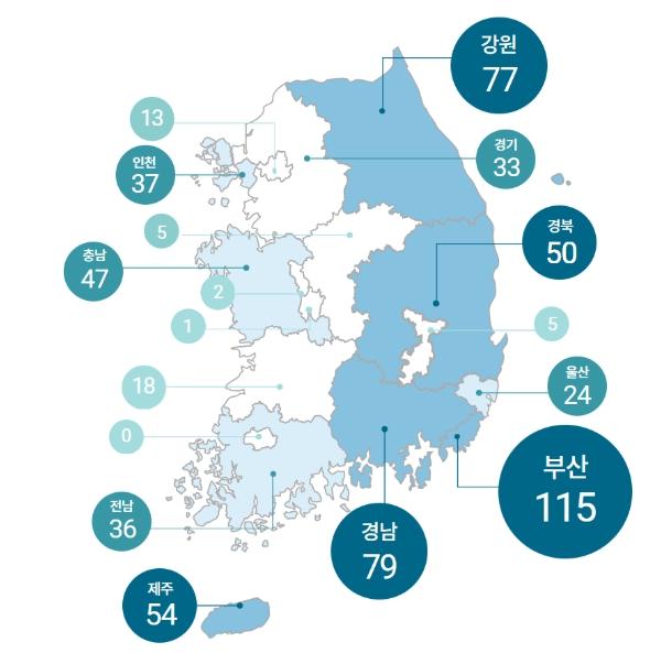 지역별로는 동해안과 남해안 주요 연안 지역이 위치한 시‧도에서 다수의 민원이 접수됐으며, 부산‧경남 등 상위 5개 시‧도가 전체 민원의 60%를 차지했다.
