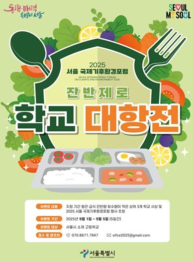 서울시는 우선 서울 소재 고등학교를 대상으로 '학교급식 잔반제로 학교 대항전'을 9월 1일부터 5일까지 5일간 진행한다. 잔반량 실적과 기대 잔반량(학교 인원수 비율에 따른 산출치)의 차이를 기준으로 평가해 우수 학교를 선정·시상하며, 수상 학교에는 서울특별시장상과 함께 ‘2025 서울 국제기후환경포럼’ 토크 콘서트 참여 특전이 주어진다.