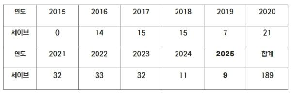 김재윤은 29일 기준 9세이브를 기록 중으로, 역대 6번째 6시즌 연속 두 자릿수 세이브 달성까지 단 1개만을 남겨두고 있다. 또한 이번 시즌 53경기, 개인 통산 599경기에 등판하며, 600경기 출장까지 한 경기만을 앞두고 있다.