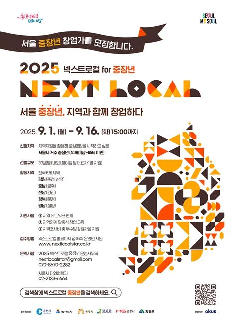 시는 지역 자원을 활용해 로컬창업에 도전할 중장년 20명을 16일까지 모집한다. 참여를 희망하는 중장년은 넥스트로컬 중장년 누리집을 통해 신청할 수 있다. 신청·접수 관련 안내는 1일 11시부터 공개된다.