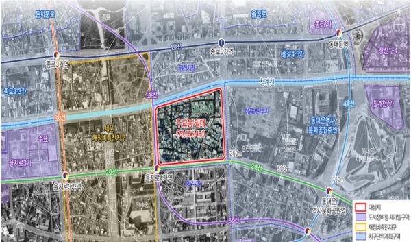 그에 비해, 해당 구역은 광장시장, 청계천 등 다양한 관광자원과 인접해 있고, 서측의 세운재정비촉진지구 사업 활성화 등 지역 여건이 변화하고 있어, 주교동의 성장 잠재력 또한, 높은 것으로 판단된다.