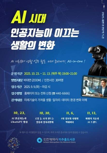 인천광역시 미추홀도서관은 시민들의 디지털 적응력 강화와 미래 사회 대비를 위해 ‘AI 시대, 인공지능이 이끄는 생활의 변화’ 특강을 운영한다고 밝혔다.