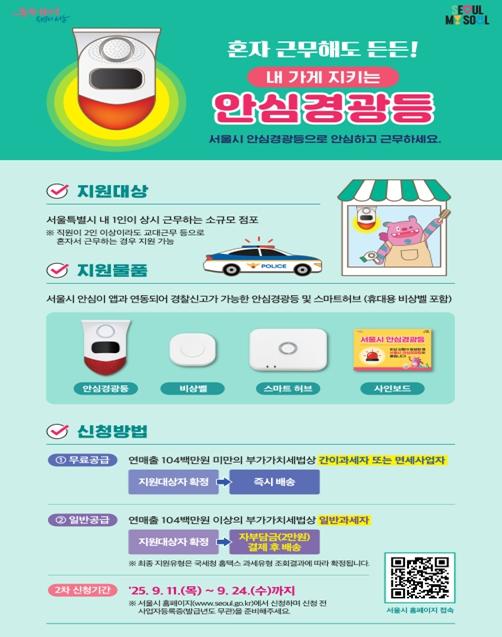 서울시가 이렇게 혼자 일하면서 불안한 상황에 놓이기 쉬운 ‘나홀로 사장님’의 안전을 지키기 위해 ‘내 가게 지키는 안심경광등’ 추가 신청을 받는다. 앞서 5월 1차 신청에 이은 2차 신청으로, 11일 오전 10시부터 9월 24일 18시까지 서울시 누리집에서 신청하면 된다.