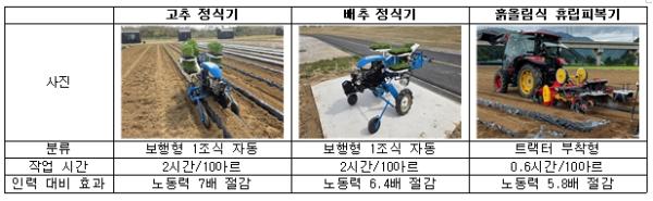 또한, 올해 주산지에서 고추‧배추 겸용 정식기와 흙올림식 휴립피복기 현장 연시와 실증시험을 진행해 현장에 적합하도록 보완하고, 앞으로 신기술 보급 사업을 추진할 계획이다.
