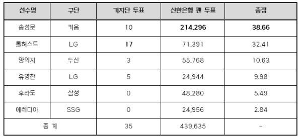 송성문은 기자단 투표 총 35표 중 10표(28.6%), 팬 투표 43만 9,635표 중 21만 4,296 표(48.7%)로 총점 38.66점을 받아, 기자단 투표 17표, 팬 투표 7만 1,391표로 총점 32.41점을 기록한 LG 톨허스트를 제쳤다.