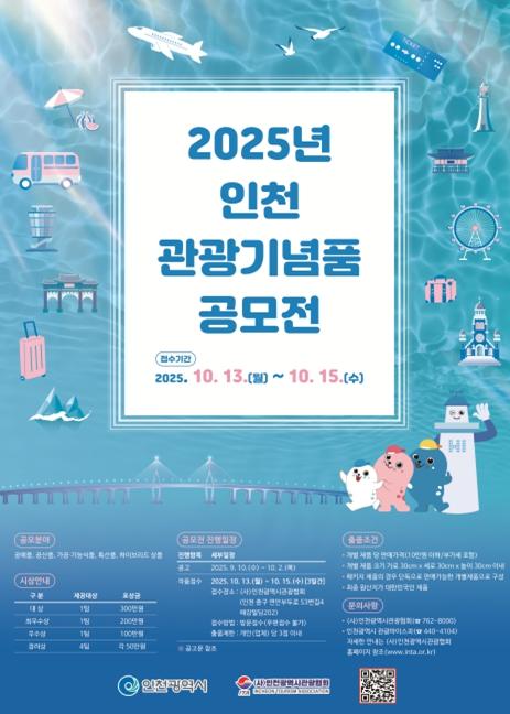 인천광역시는 인천을 찾는 국내외 관광객들에게 오래도록 기억에 남을 특별한 추억을 선사할 수 있도록, 인천만의 고유한 특성을 담은 실용적인 관광기념품을 발굴하기 위해 ‘2025년 인천 관광기념품 공모전’을 개최한다고 밝혔다.