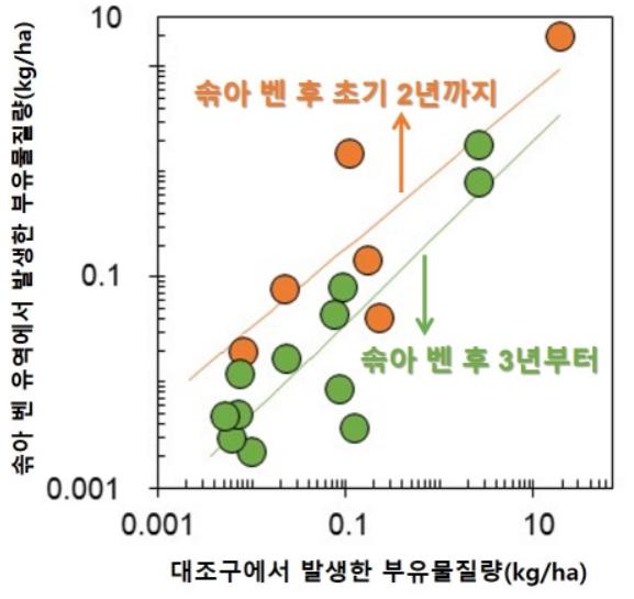 분석 결과, 솎아베기를 한 유역은 초기 2년 동안 솎아베기를 하지 않은 유역보다 부유물질량이 평균 4.3배 많았으나, 3년 후부터 두 유역 간 차이가 없었다.