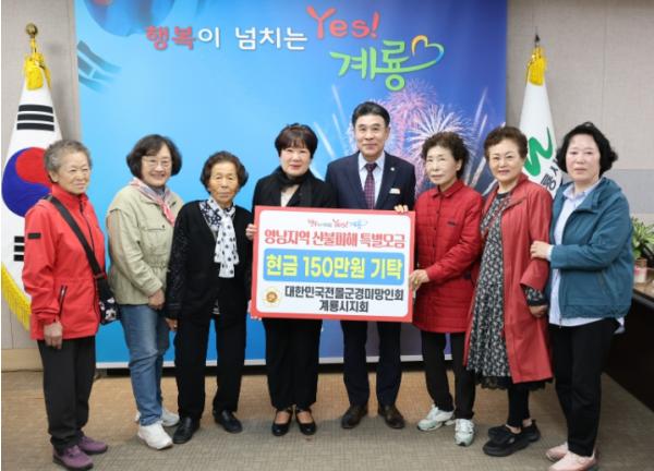 계룡시는 대한민국 전몰군경 미망인회 계룡시지회(회장 구순조)에서 산불 피해 복구에 써달라며 현금 150만 원을 기탁해 왔다고 밝혔다.