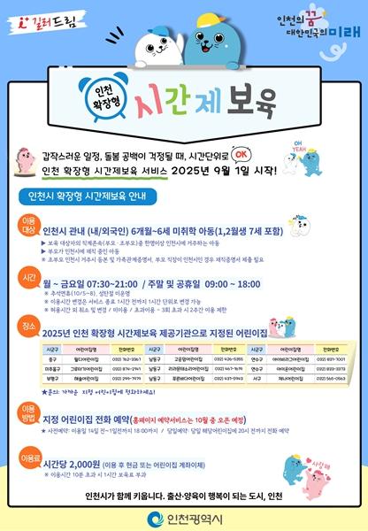한편, 이번 ‘아이플러스(i+) 길러드림’ 확장형 시간제 보육은 인천시가 추진하는 저출생 극복을 위한 ‘아이플러스(i+) 출생정책 6종(이어드림, 맺어드림, 1억드림, 집드림, 차비드림, 길러드림) 시리즈’중 하나로, 생애주기별 맞춤형 지원을 통해 아이 낳고 키우기 좋은 도시 조성에 기여할 것으로 기대된다.