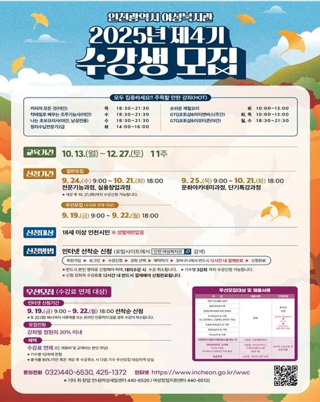 인천광역시 여성복지관은 오는 9월 19일부터 ‘2025년도 제4기 사회교육강좌’ 수강생을 모집한다고 밝혔다.