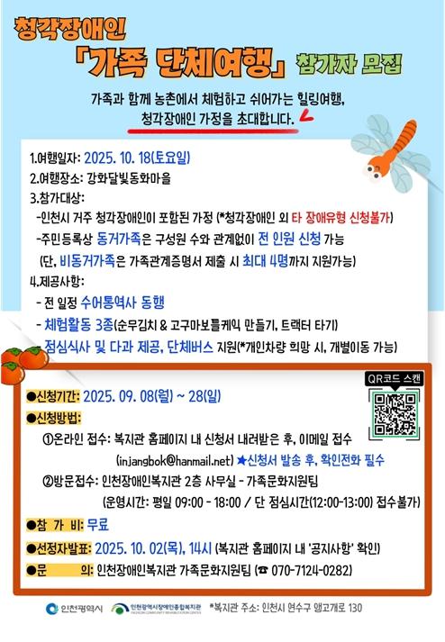 인천시사회서비스원 소속 인천장애인종합복지관은 청각장애인 가족 단체여행 참가자를 모집한다고 17일 밝혔다.
