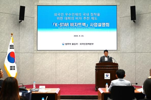 법무부는 9월 23일 'K-STAR 비자트랙'제도의 이해를 돕기 위해 정부과천청사에서 관계부처와 27개 대학을 대상으로 사업설명회를 개최하고, 미래성장동력을 이끌 외국인 우수인재 유치 및 정착 지원을 위한 비자 운영 계획을 소개했다.