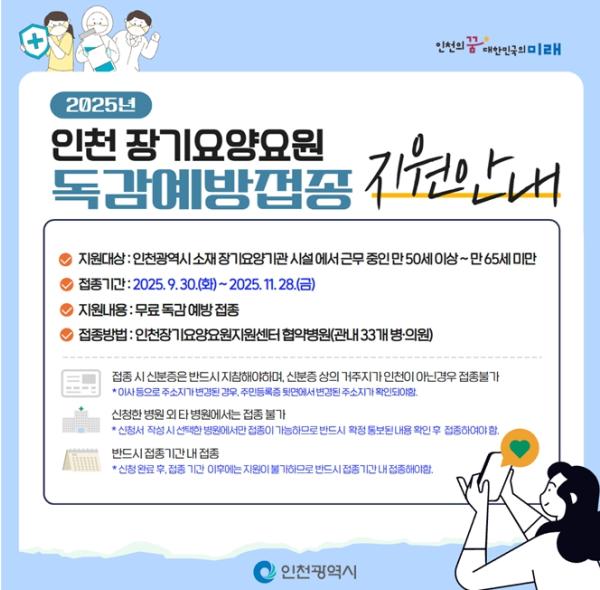 인천광역시는 노인 감염취약시설인 장기요양기관 종사자 1만여 명의 건강권 확보와 처우 개선을 위해 오는 9월 30일부터 11월 28일까지 약 9주간 무료 독감 예방접종을 실시한다고 밝혔다.
