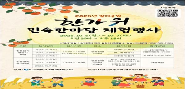 인천광역시 월미공원사업소는 오는 10월 5일부터 7일까지 3일간 월미공원 내 전통정원(양진당)에서 ‘한가위 민속한마당 체험행사’를 개최한다고 밝혔다.