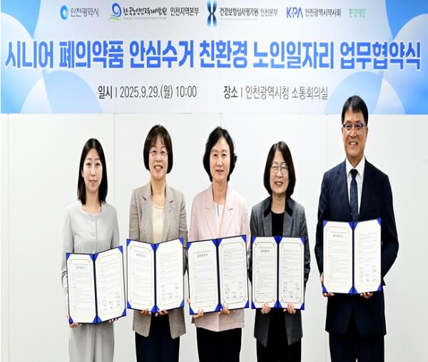인천광역시는 9월 29일 시청 청사에서 건강보험심사평가원 인천본부, 인천시약사회, 환경재단, 한국노인인력개발원 인천본부와 함께‘폐의약품 안심분리수거 노인일자리 확대 업무협약’을 체결했다고 밝혔다.