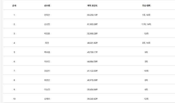2위 김상현과 10위 김태우(27.(주)하이니스임플란트)의 포인트 격차는 22,659.96포인트다. 또한 10위 김태우와 13위 이승형(22), 17위 김범수(27)와 포인트 차는 각각 10,221.45포인트, 12,766.24포인트다. 10위 김태우와 20위 하충훈(35.㈜일신테크놀로지)와 차이는 16,500.06포인트다.