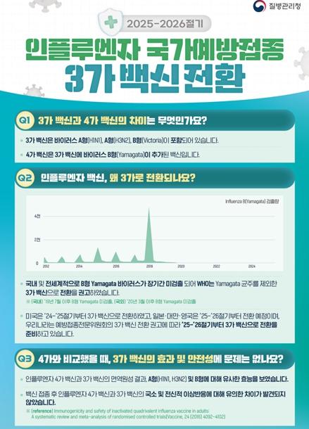 이번 인플루엔자 백신은 세계보건기구(WHO)의 권고사항과 예방접종전문위원회 심의에 따라 기존 4가 백신에서 3가 백신으로 전환*된다.