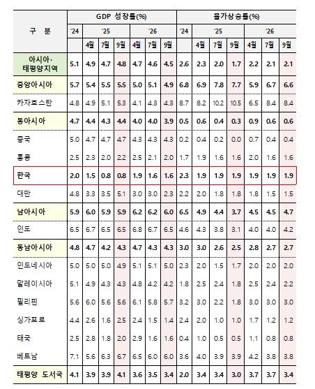 한편, 아시아개발은행은 한국의 ’25년 성장률에 대해서는 7월에 발표한 전망치인 0.8%를 유지했다. 7월 전망은 건설투자 감소, 수출 둔화, 부동산시장 약세 등을 반영하여 4월 전망에 비해 0.7%p 하향 조정된 바 있다. 아시아개발은행은 건설경기 부진, 미국의 관세 인상 및 관련 불확실성 등이 지속되면서 7월 전망치를 유지했으나, 정부의 확장적 재정정책과 완화된 통화정책은 하반기 내수 회복에 기여할 것이라고 평가했다. 아울러 ’26년 경제성장률도 7월과 동일한 1.6%로 전망했다.