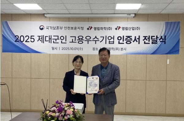 국가보훈부 인천보훈지청(지청장 직무대리 최은진) 제대군인지원센터는 2025년 10월 1일에 제대군인 주간을 맞아 영림그룹의 계열사인 영림화학(주)과 영림산업(주)을 방문하여 제대군인 고용 우수기업인증에 대한 현판식을 개최했다.