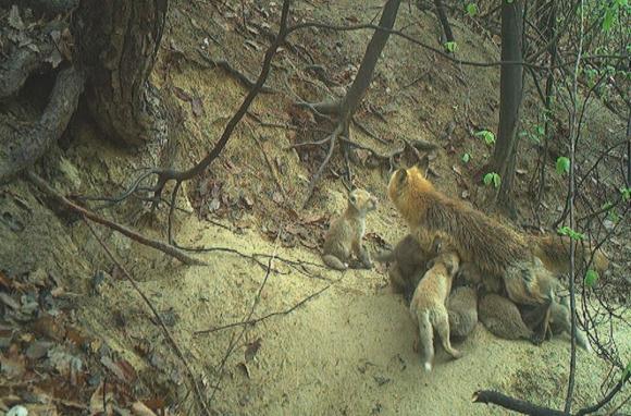 이번 영상에는 소백산에서 어미 여우(멸종위기 야생생물Ⅰ급)가 무려 12마리의 새끼를 양육하는 모습(2024년 4월 16일)도 담겼다. 영상 속 어미 여우(6세 추정)는 굴 주변에서 새끼들에게 젖을 물리며 보살피고 있다. 특히 이 영상을 통해 해당 어미 여우가 이전에 출산했던 개체(암컷 2세 추정)와 함께 다니며 각자의 새끼를 함께 돌보는 공동양육 모습도 관찰됐다.