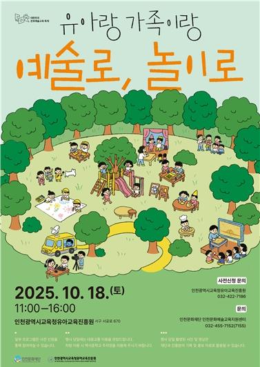 (재)인천문화재단은 인천광역시교육청유아교육진흥원과 협력하여 2025 대한민국 문 화예술교육 축제와 연계된 '유아랑 가족이랑 예술로, 놀이로' 행사를 10월 18일 오전 11시부터 오후 4시까지 인천광역시교육청유아교육진흥원에서 개최한다.