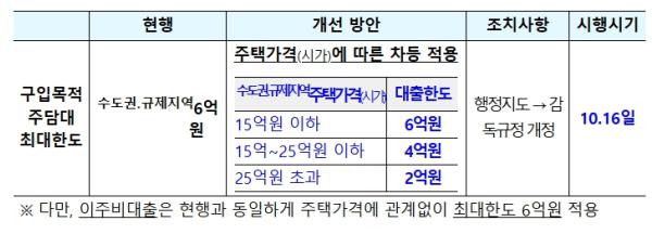 수도권·규제지역에 적용되는 주택구입목적 주담대의 대출한도(現 6억원)를 주택가격(시가) 수준에 따라 차등 적용한다. 수도권 · 규제지역의 ➊시가 15억원 이하 주택의 주담대 한도는 현행과 동일한 6억원, ➋시가 15억원 초과~25억원 이하 주택은 4억원, ➌시가 25억원 초과 주택은 2억원으로 대출한도를 차등 적용한다. 이를 통해 수도권·규제지역 내에서 대출을 활용한 고가주택 구입 수요를 보다 강력하게 관리해 나갈 예정이다.