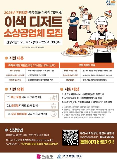부산시와 (재)부산경제진흥원은 올해 소상공인 유망업종을 '이색 디저트' 업종으로 정하고, 해당 업종의 지역 소상공인 10개 사를 선정해 공동·특화 마케팅을 지원한다고 밝혔다.