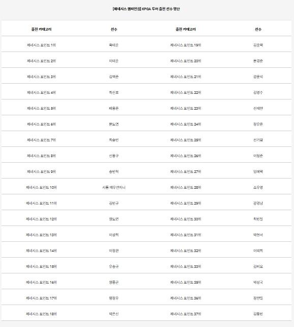 제네시스 포인트 1위 옥태훈(27.금강주택)을 비롯해 2위 이태훈(35.캐나다), 3위 김백준(24.속초아이), 4위 최진호(41.COWELL), 5위 배용준(25.CJ), 6위 문도엽(34.DB손해보험), 7위 최승빈(24.CJ), 8위 신용구(34.금강주택), 9위 송민혁(21.CJ), 10위 사돔 깨우깐자나(27.태국)까지 제네시스 포인트 TOP10 선수들과 36위 정한밀(34.경희), 37위 김동민(27.NH농협은행)까지 제네시스 포인트 상위 36명이 참가자 명단에 이름을 올렸다.
