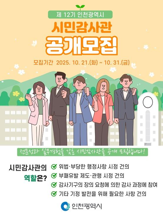 인천광역시는 제12기 시민감사관을 10월 21일부터 10월 31일까지 공개모집한다고 밝혔다.