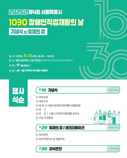 서울시는 10월 23일 오후 2시, 마포구 월드컵컨벤션에서 '제4회 서울특별시 1030 장애인직업재활의 날 기념식 및 축제의 장'이 열린다고 밝혔다.
