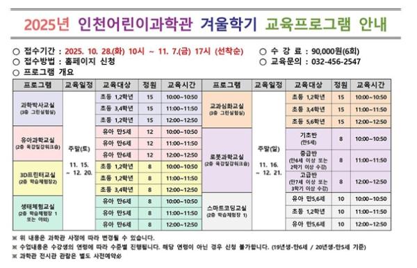 신청은 이달 28일 10시부터 인천어린이과학관 홈페이지에서 선착순으로 가능하며 자세한 커리큘럼 등의 내용은 인천어린이과학관 홈페이지 공지 사항에서 확인할 수 있다.