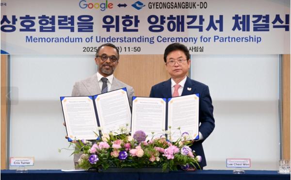 경상북도와 구글은 9일 도청에서 이철우 도지사, 양금희 경제부지사, 크리스 터너 구글 글로벌 부사장, 황성혜 구글코리아 부사장 등이 참석한 가운데 ‘상호협력체계 구축을 위한 양해각서 체결식’을 개최하고, 앞으로 지속적인 파트너십 구축에 합의했다.