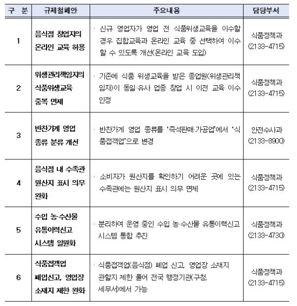 '창업 시 온라인 식품위생교육 허용‧‘반찬가게’도 식당과 동일한 영업기준 적용 요청'