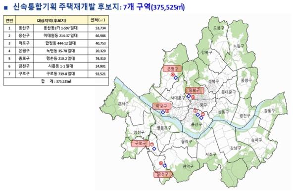 신규 지정 대상은 용산구 2곳, 마포구 1곳, 은평구 1곳, 금천구 1곳, 구로구 1곳, 종로구 1곳으로 총 7개 구역이다. 종로구 행촌동 210-2 일대 외 6개소(총 0.38㎢)이며, 효율적인 구역 관리를 위해 기존 신속통합기획 주택재개발 선정 구역과 동일한 만료 기간으로 설정했다.