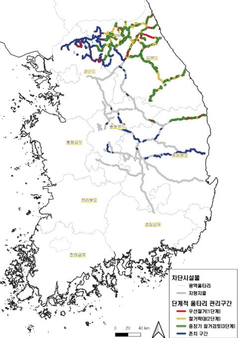 광역울타리 관리는 크게 철거와 존치로 구분하고, 철거는 우선철거·철거 확대·중장기 철거 검토 3단계로 구분해 관리한다.