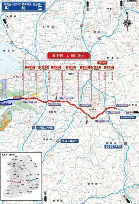 새만금-전주 고속도로는 전라북도 김제시 진봉면에서 전주시를 거쳐 완주군 상관면을 연결하는 총 연장 55.1km의 왕복 4차로 도로로 총사업비 2조 7,424억원을 투입했다.