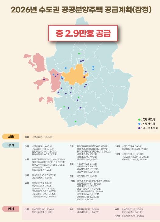 국토교통부와 4개 공공기관은 ’26년 수도권 공공택지에서 총 2.9만호 규모의 공공분양주택을 순차적으로 공급할 계획이라고 밝혔다.