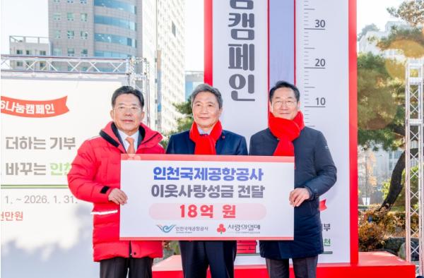 인천국제공항공사(사장 이학재)는 1일 오후 인천광역시청 앞 애뜰광장에서 진행된 ‘희망 2026 나눔 캠페인’출범식에 참여해 인천사회복지공동모금회(회장 조상범)에 지역 사회공헌 성금 18억 원을 전달했다고 밝혔다.
