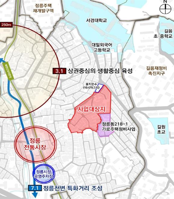 또한, 용도지역 상향, 기반시설 정비 및 공공시설 계획 등이 포함됐다. 대상지 내 제2종(7층) 지역은 효율적 토지이용계획 수립을 위해 적정 개발단위의 통합 시행 및 경관을 보호하는 범위에서 제3종으로 용도지역을 상향하여 아파트 건축이 가능하도록 지역 내 용도지역 상향을 전제한 정비 가이드라인을 제시했다. 또한 대상지는 협소한 도로폭과 주차난으로 주거환경이 열악하고 보차혼용도로로 조성되어 있어 보행 안전을 위해 정비가 필요한 지역으로 도로폭을 확장하고, 보차분리로 차량과 보행체계를 개선했다. 특히 안전한 보행환경 조성을 위하여 간선도로인 삼양로변에 차량 진출입 불허구간을 설정했다. 인근 지역과 연계되는 삼양로98길 및 노해로9길 구간은 주가로와 커뮤니티 가로로 조성하여 가로활성화시설 집중 배치를 통해 지역주민도 함께 이용할 수 있도록 계획했다.
