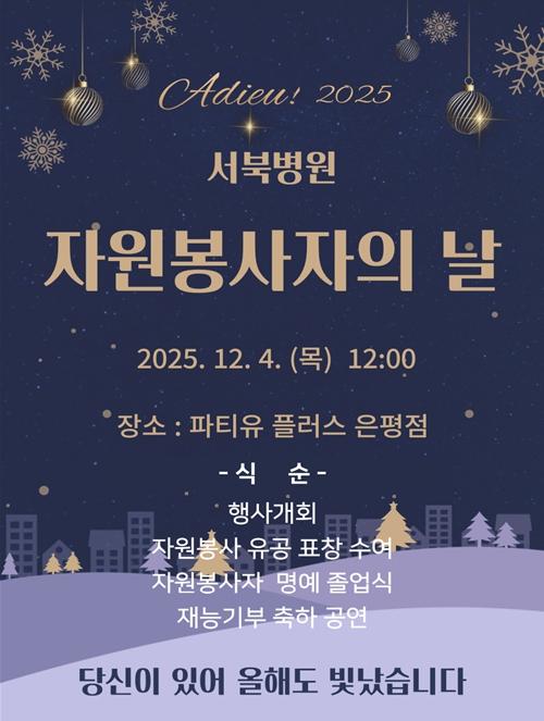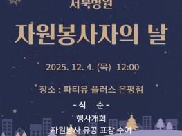 서울시 서북병원은 UN 지정 국제기념일인 ‘자원봉사자의 날’을 맞아 12월 4일 파티유플러스 은평점에서 ‘2025년 서북병원 자원봉사자의 날 기념행사’를 개최한다고 밝혔다. 이번 행사는 1년 동안 의료취약계층 환자의 곁을 지키며 따뜻한 손길을 전해 온 자원봉사자들의 노고를 격려하고, 자원봉사 문화 확산과 지역사회와의 동행을 다짐하는 자리로 마련됐다.
