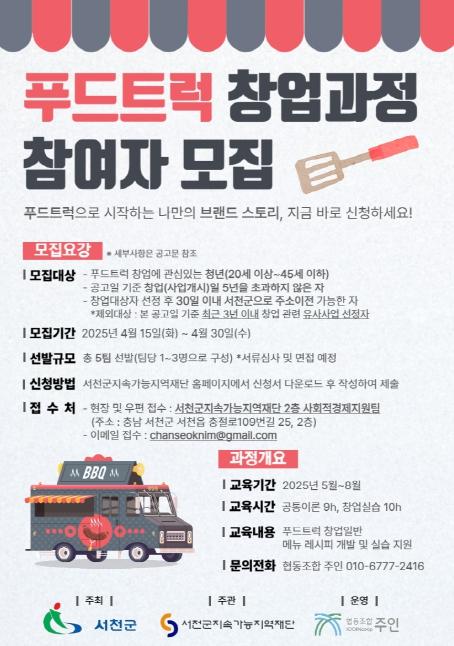 이번 사업은 군이 주최하고, (재)서천군지속가능지역재단과 사회적협동조합 ‘주인’이 공동 주관하며, 푸드트럭 창업을 희망하는 만 20세부터 45세 이하의 예비·초기 창업자를 대상으로 진행된다.