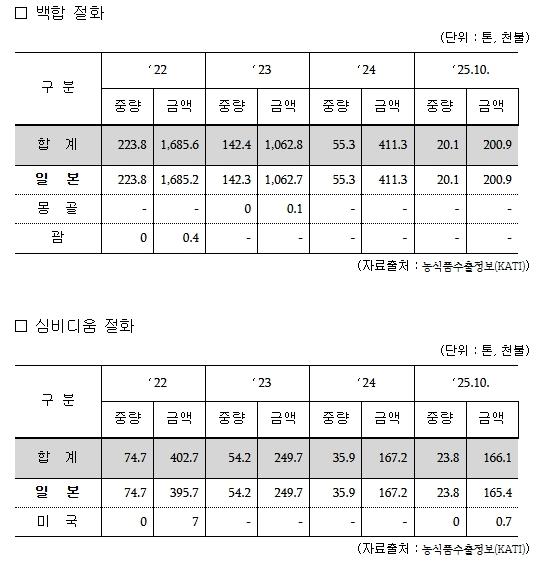 이번 협상 타결로 백합과 심비디움 절화는 배(1999년), 포도(2012년), 감귤(2022년)에 이어 뉴질랜드로 수출 가능한 품목이 됐다.